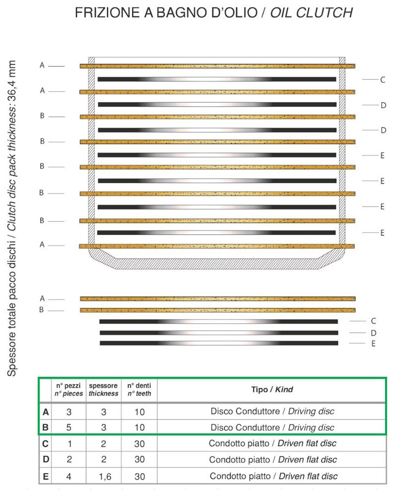 Set of clutch friction plates in high performance friction material. The inner and outer discs are in a standard material.